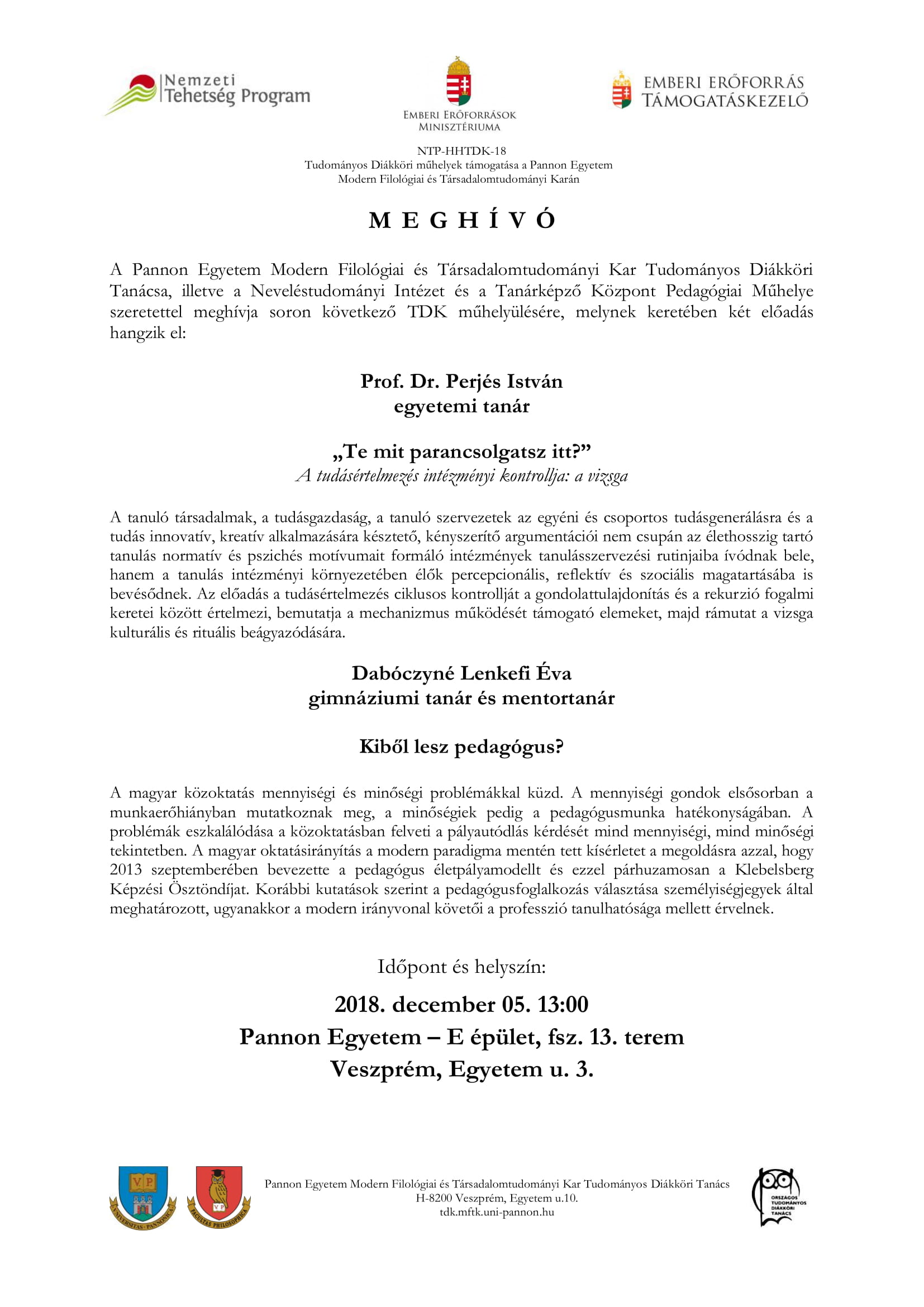 Prof. Dr. Perjés István: "Te mit parancsolgatsz itt?" - A tudásértelmezés intézményi kontrollja: a vizsga (2018. 12. 05) [meghívó, jelenléti ív]